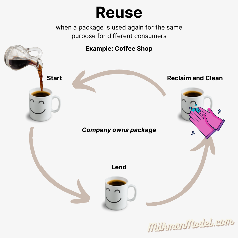When a package is used again for the same purpose for different consumers. Reuse is usually free and the company owns the container.